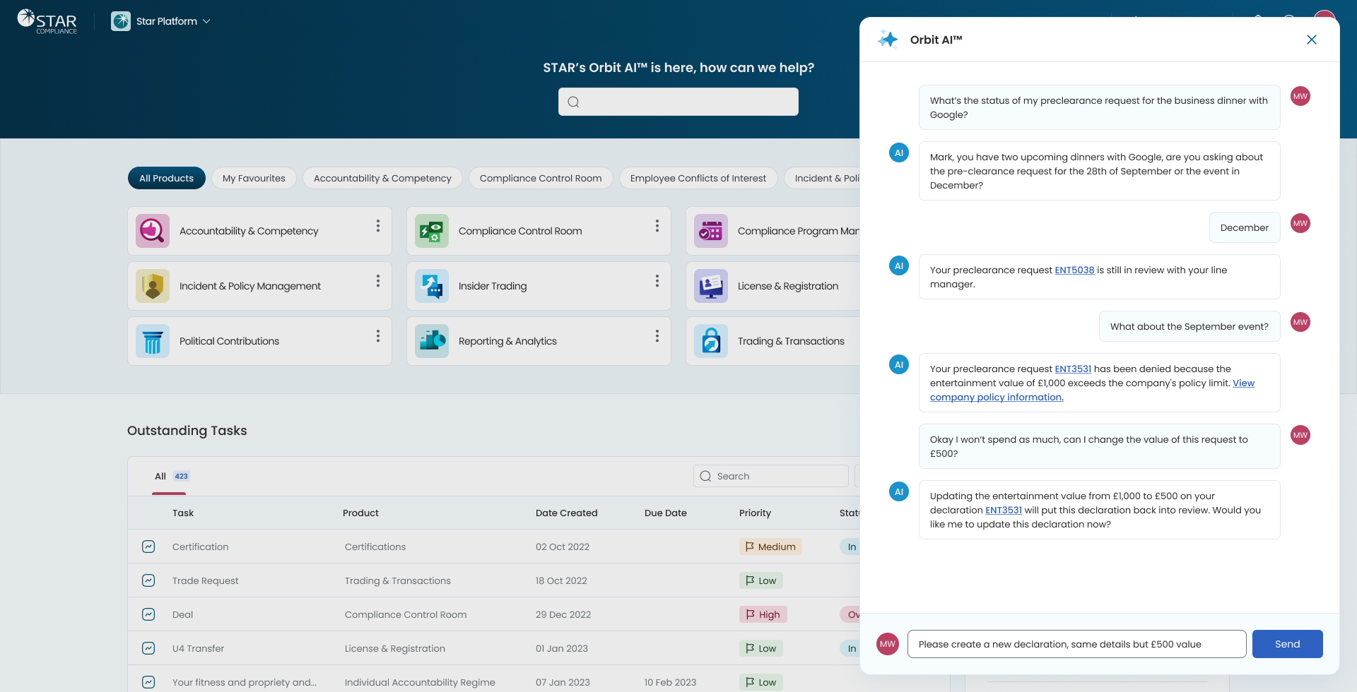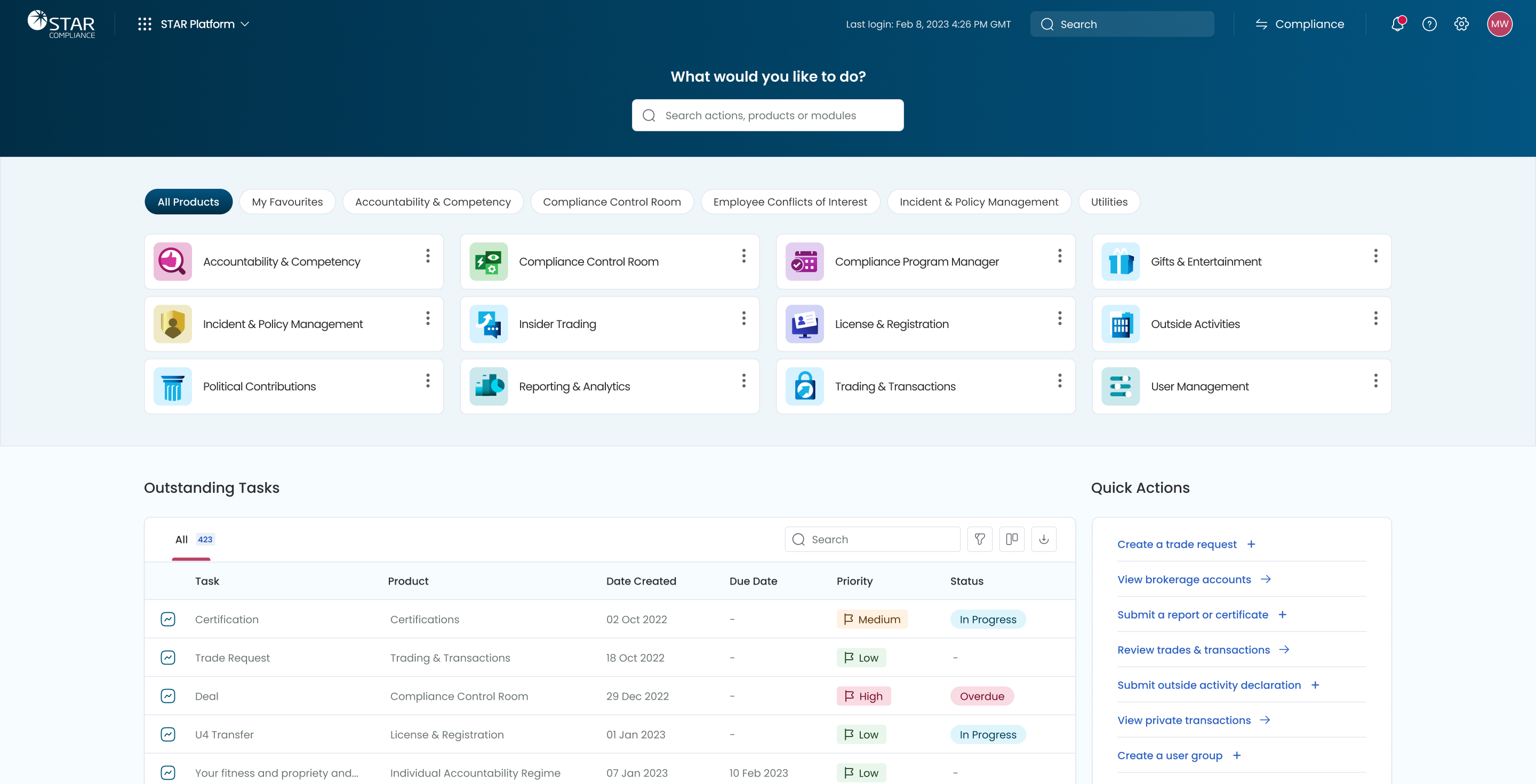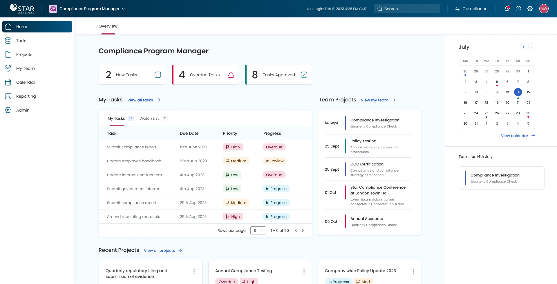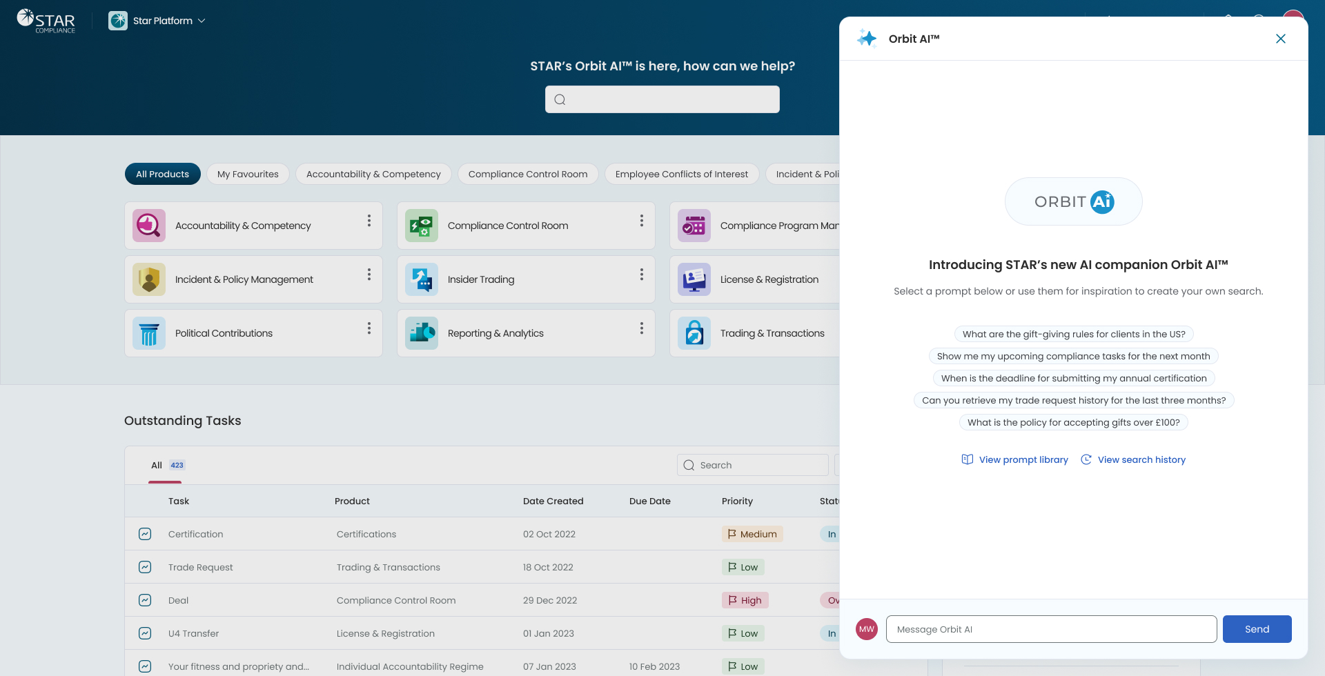 The Compliance Program Manager was a new product they were planning to launch as part of the new STAR Platform suite. This relatively straight forward product allows compliance office to manage their weekly and monthly compliance tasks.