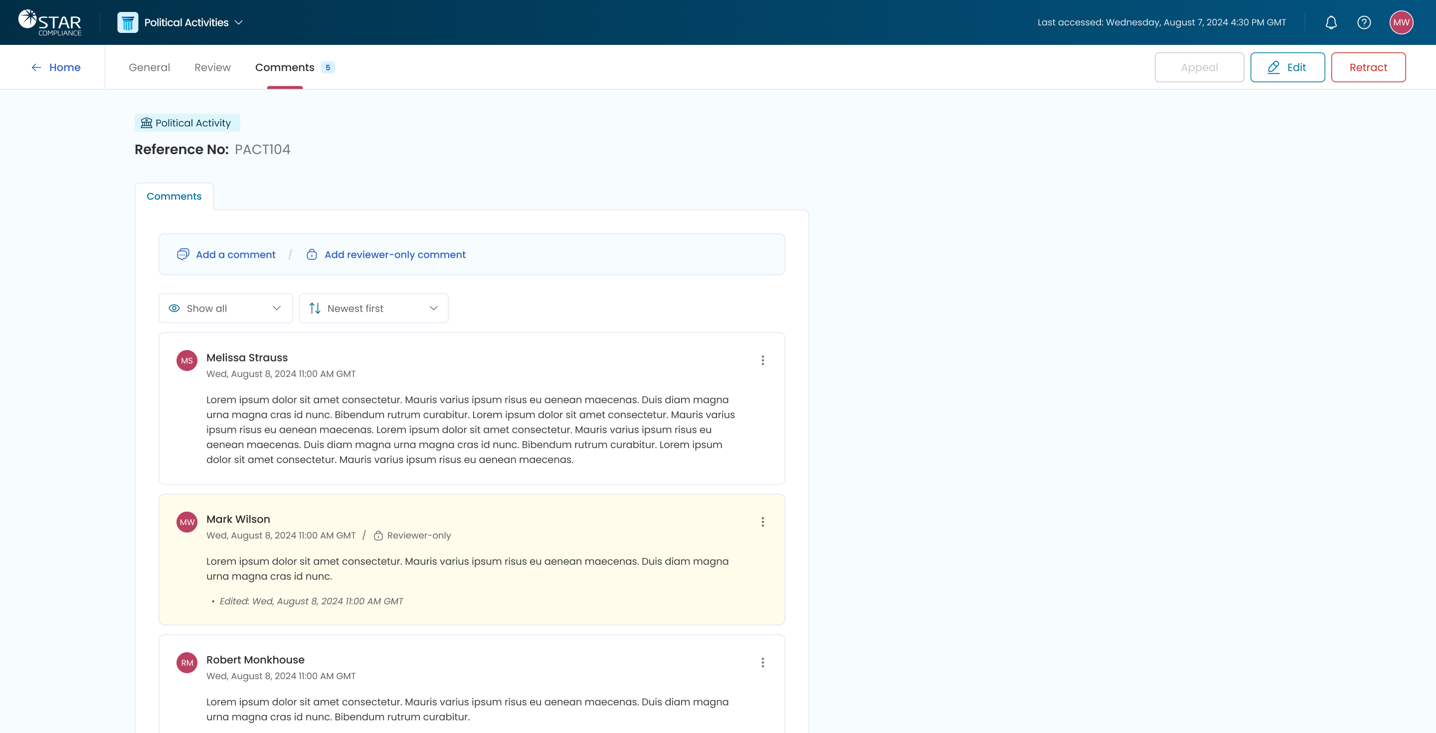 User Interface for the comments feature on a political declaration.