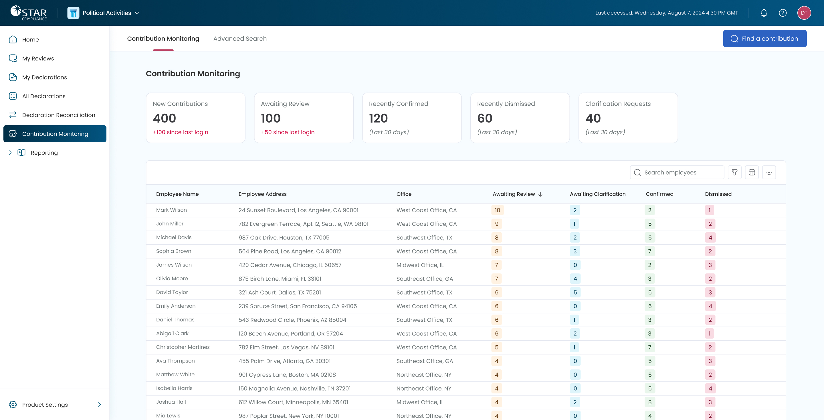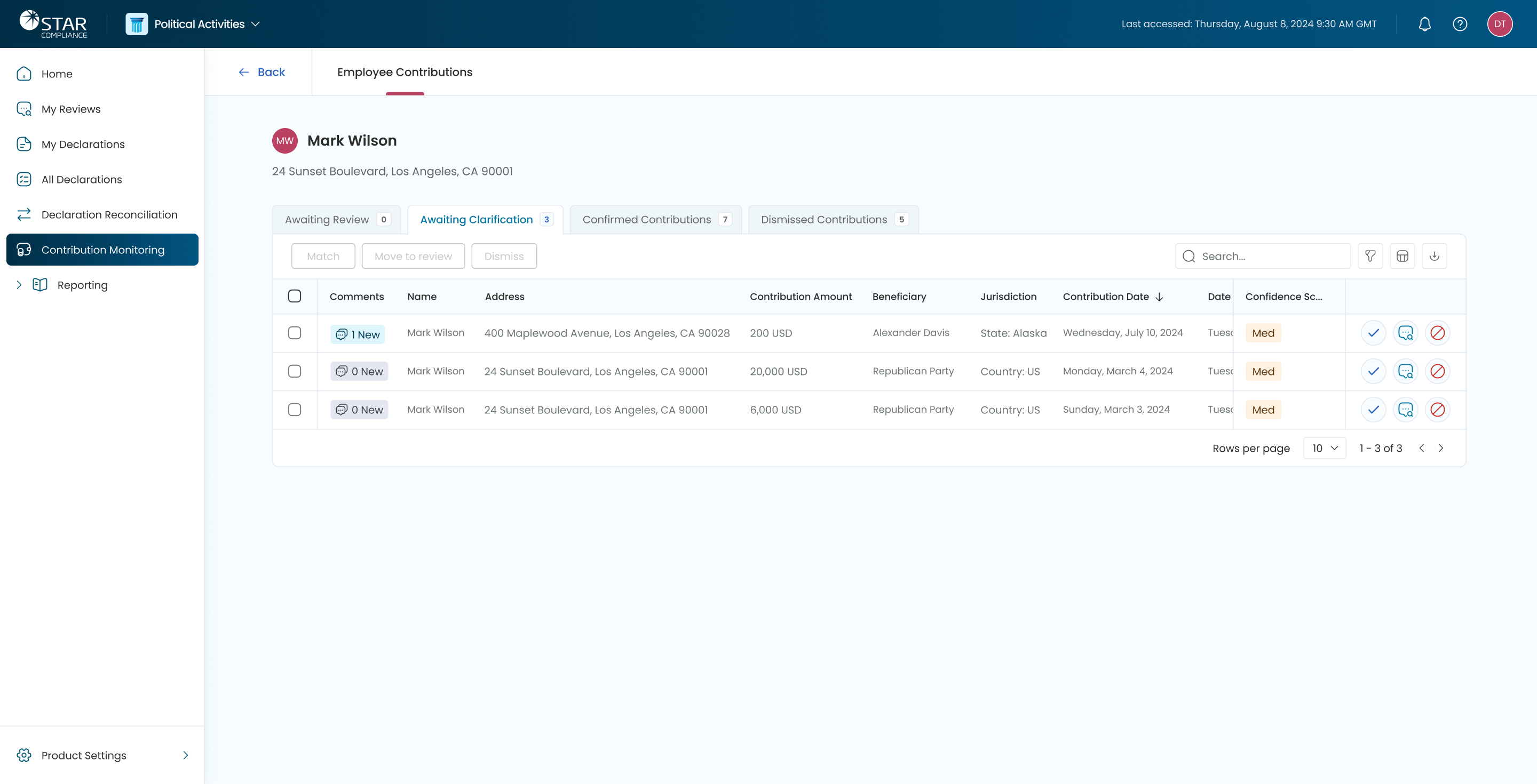Employee contributions screen for compliance officers to review, clarify, confirm and dismiss contributions.