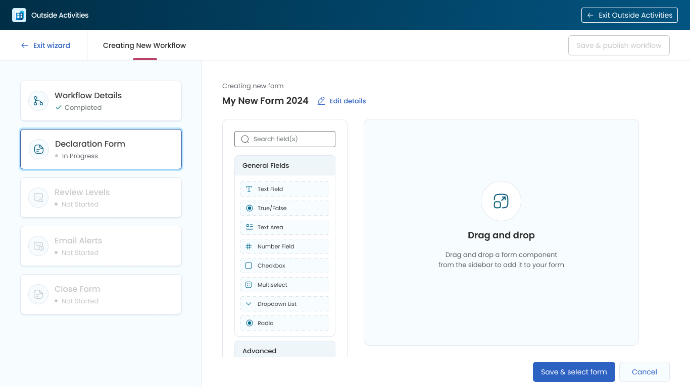 Compliance monitoring can be really complex and configurable. The above screenshot shows one of the designs I created for a 'Workflow Wizard' where users are guided through creating their own custom forms, with their own review levels, rules, email alerts and more. We designed a drag and drop editor to build out the form. (Laptop Screenshot)