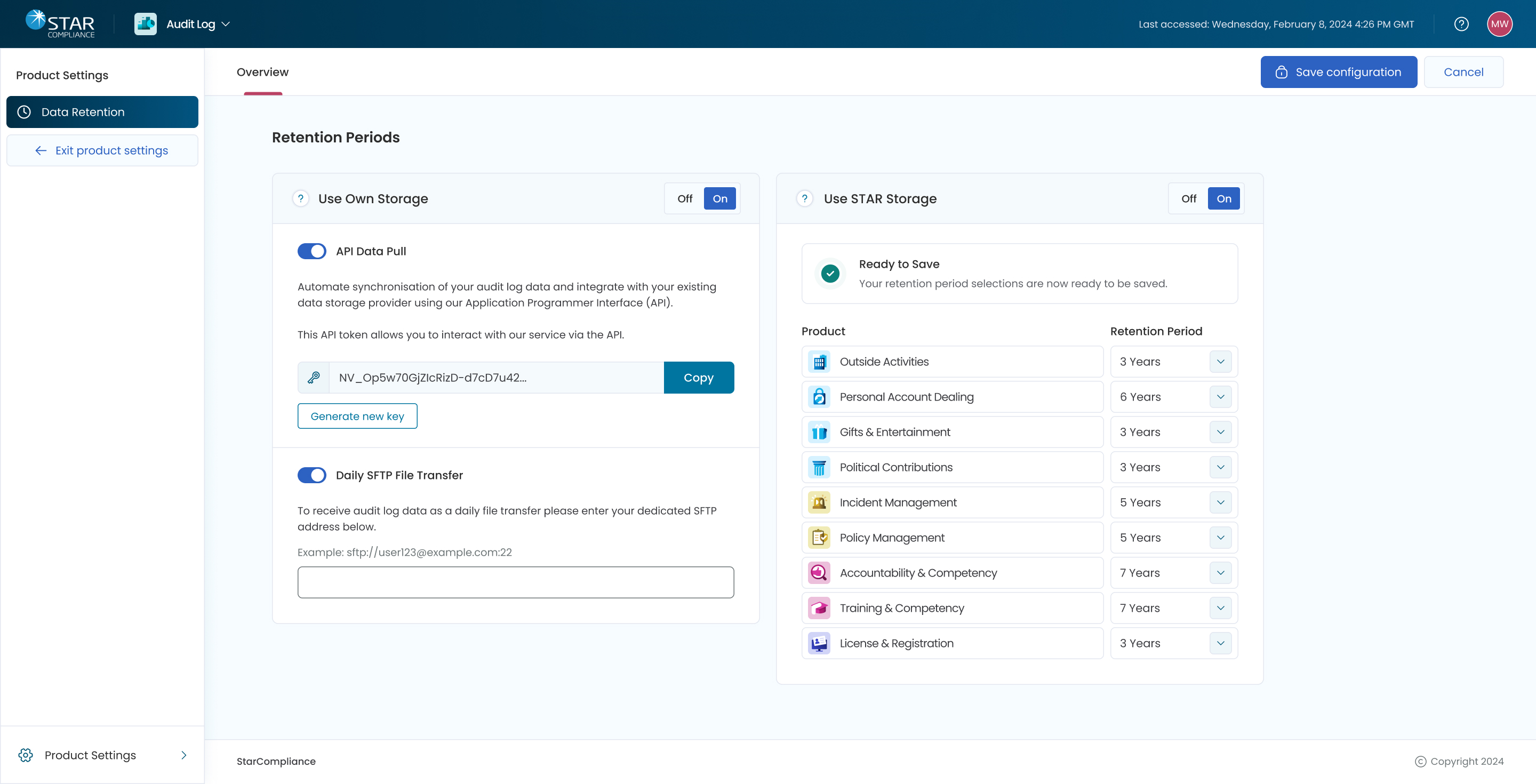 As part of the audit service configuration settings, users needed to be able to manage their data storage. If they chose to use STAR's data storage, from here they need to also handle their data retention periods, in accordance with their Country's compliance rules and regulations.